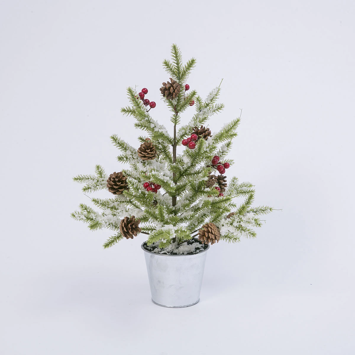 All in one Holiday tree with embellishments in a silver bucket. With pine cones, faux snow and red berries, an all in one Christmas decoration.Â