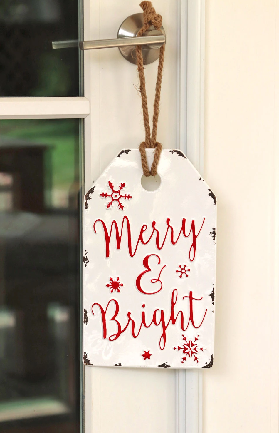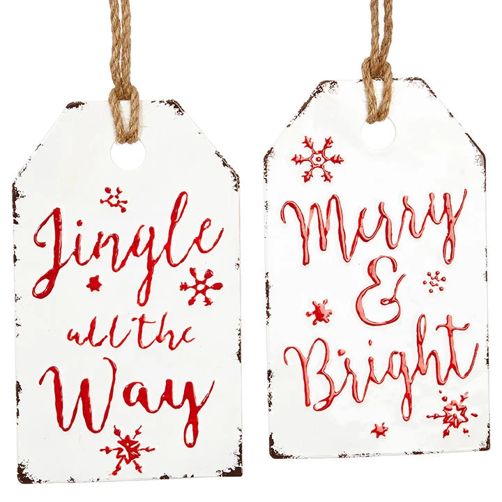 Vintage style gift tag shaped ornament. Classic enamel finish on metal with embossed holiday greetings 2 Assorted styles.Â