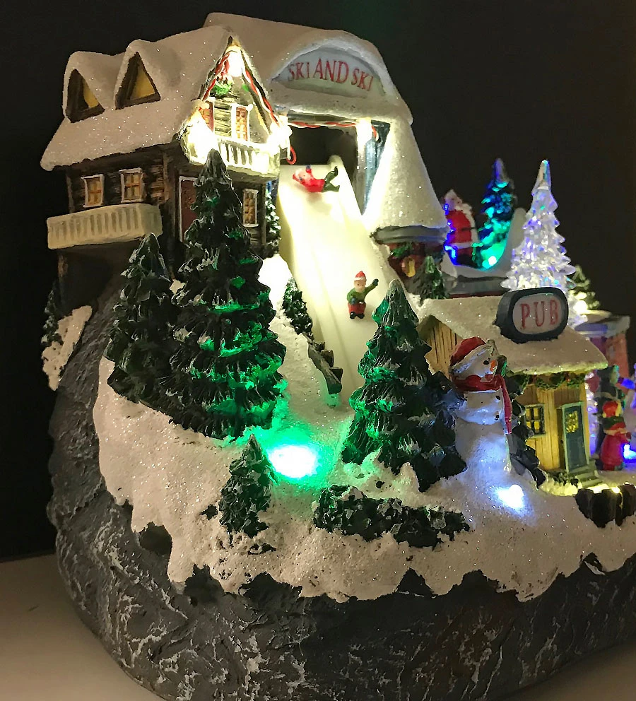 The Ski Village Has a Pub, shimmery snow, an acrylic tree which spins and lights up. Santa with his jolly self on the roof of the village and carolers in the village surrounded by snow capped evergreens.