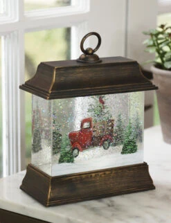9.5 Inch Woodland Truck Scene Lighted Water Lantern In Swirling Glitter