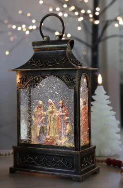 Antique Bronze Nativity Scene Lighted Water Lantern With Swirling Glitter