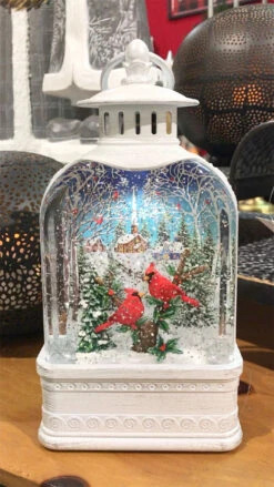 White Lighted Water Lantern With Cardinals And Town Scene Snow Globe – 10.5 Inch